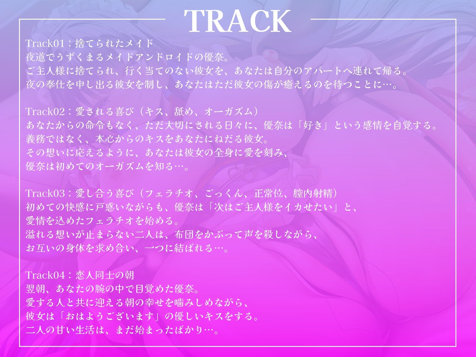2026-02-01に才色兼ビッチからリリースされた ファンタジー・メイド・巨乳・中出し・フェラ・ラブラブ・あまあま・ロボット・男性向け・成人向け・ASMR・オホ声・KU100に関する作品です。 「「ご主人様に捨てられてしまいました…」貴方に出会い、心を宿したアンドロイドが、本当の愛を知るまでの物語…。【KU100収録】」。 収録数:4本 (約22分)+αです。 販売価格は198円(定価990円)です。